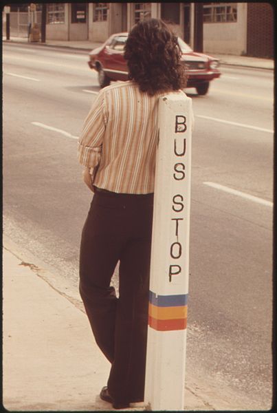 Cool dude waiting for a MARTA bus in Atlanta, 1974. This photo comes from Wiki Commons, with a note that there was a spike in ridership at this time because the fare was reduced from 40 cents to 15 cents. Also, new routes and buses had been recently added.