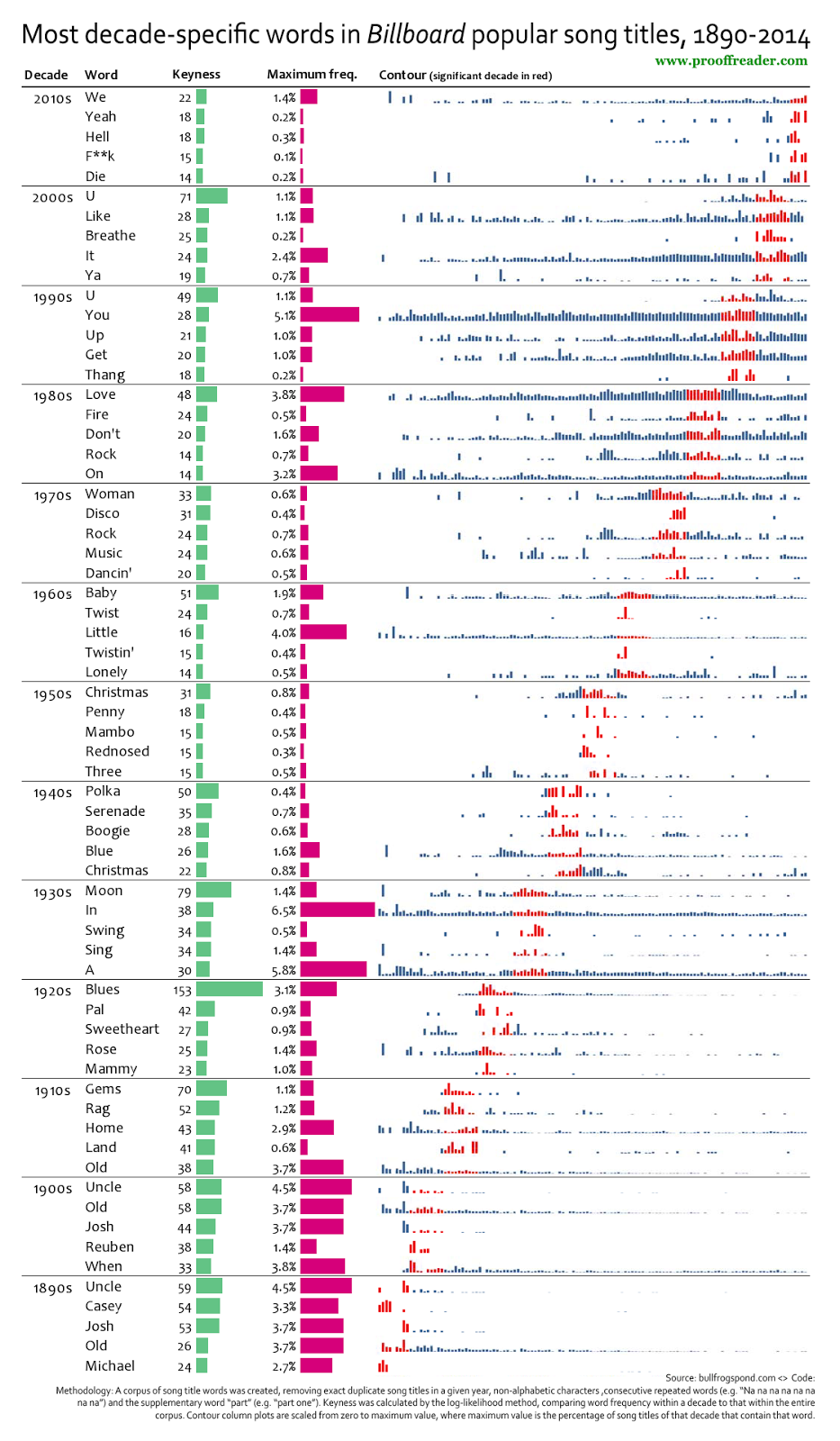 December 16, 2014 December 16, 2014 image Most decade-specific words in Billboard popular song titles, 1890-2014 | prooffreader.com. (via)