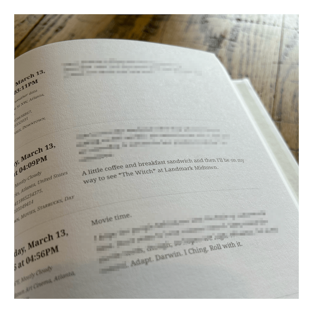 I used a pretty straightforward Python script to parse the JSON to grab the journal entries, assemble them into HTML blocks, and stitch them all together. I added a dash of CSS to get the layout where I wanted it. With all entries assembled, the script converts the HTML to a PDF. And the PDF, I sent that off to a printer – I used Mixam without really doing much research. I’m happy enough with the results, and appreciated their simple interface to upload and preview the content. (Funny surprise to see the actual printing and shipping was done in the UK. These journals have traveled more than I have lately.)