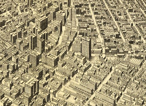 This is an image from the 1919 Foote and Davies map of Atlanta, taken from the very cool Big Map Blog. We can see what the built environment of downtown Atlanta looked like (and might have continued to look like) before the interstates and their ramps sliced wide chasms of asphalt and concrete through the area.