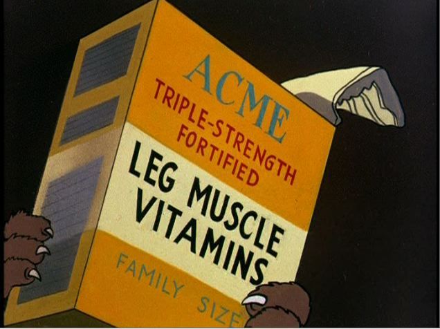 Acme Triple-Strength Fortified Leg Muscle Vitamins. From Stop, Look and Hasten (dir. Charles M. Jones, 1954). I love the use of the Acme Corporation as a go-to, generic component of Looney Tunes. Surely someone’s written a dissertation about this.
