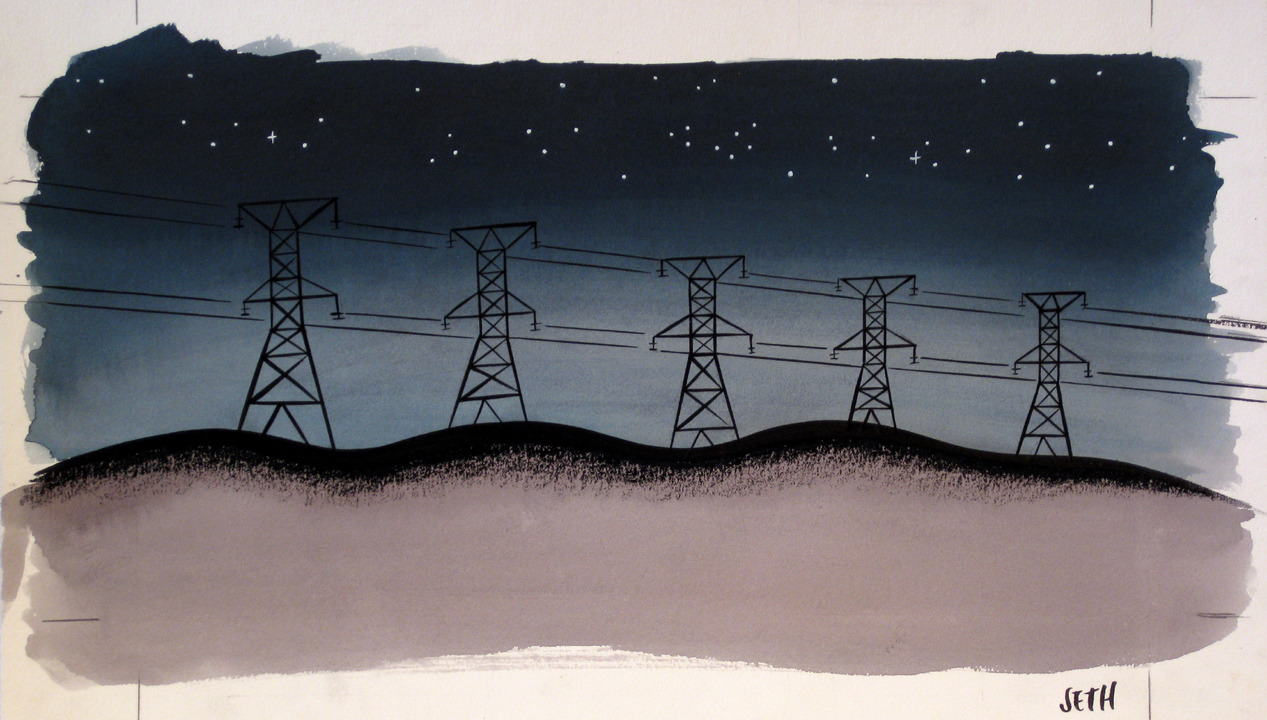 Double Page Spread of Electrical Towers, 2002 by Seth for Aimee Mann’s “Lost in Space”. Part of the exhibition for George Sprott 1894-1975. The man has a way with gouache. (via)