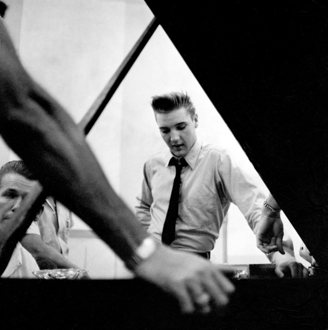 By the way, for all you bums tumbling without credit, this photo is by George H. Barker for The Tennessean (which has a lot of great Elvis photos), during the June 10, 1958 RCA studio session in Nashville. Perhaps he’s taking a break with Chet Atkins, Hank Garland, and the Jordanaires after recording I Need Your Love Tonight or A Big Hunk o’ Love? A little credit/context goes a long way.